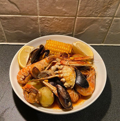 Use a very large pot (we use a 40 quart pot), fill it half full with water; bring water to a full boil. Add salt, shellfish boil, sausage, and potatoes. Let cook until the potatoes are approximately 1/2 completed cooking.